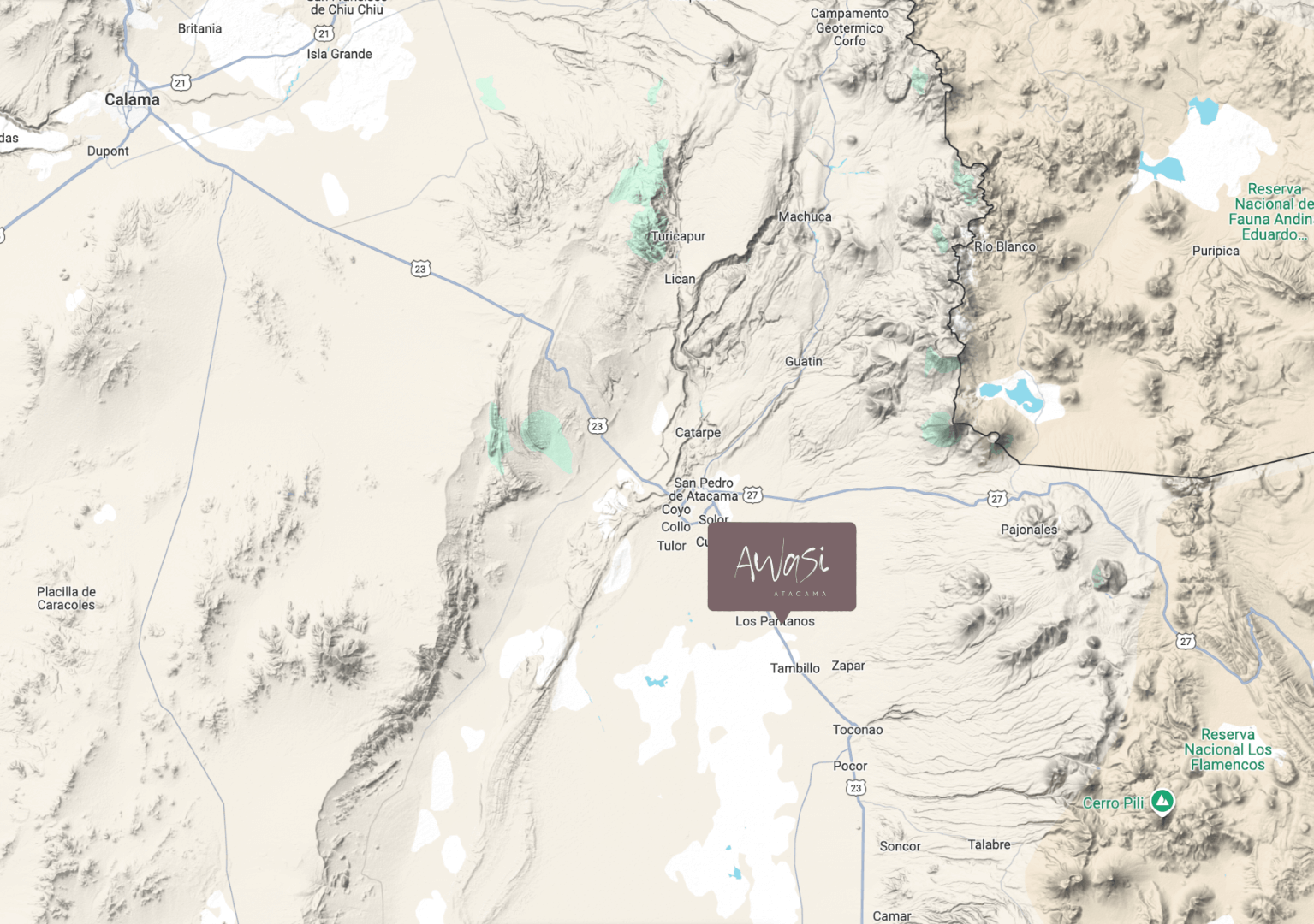 Fly to Calama (CJC) 100 km / 1:30 hs from Awasi. Awasi includes private transfers from and to Calama in accordance to our check in & check out times. Our team can suggest different alternatives for transfers from other places.
